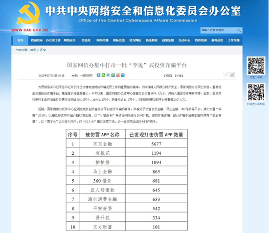 国家网信办反诈中心监测发现多起仿冒投资平台进行诈骗的事件。诈骗分子仿冒京东金融、马上金融、360借条等平台,推出大量“李鬼”式APP,以相似标志和产品介绍以假乱真,以“小额返利”等诱导网民进行访问下载,进而实施诈骗。部分诈骗平台甚至宣称具有“国企背景”,以“国字头”名义吸引用户,以“拉人头”模式发展下线,给一些网民造成巨大财产损失。