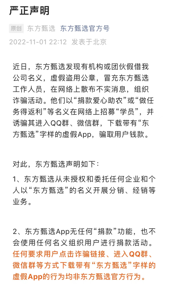 11月初,东方甄选官方号发布声明称,有机构或团伙假借公司名义,虚假盗用公章,冒充东方甄选工作人员,在网络上散布不实消息,组织诈骗活动。他们以“捐款爱心助农”或“做任务得返利”等名义在网络上招募“学员”,并诱骗其进入QQ群、微信群,下载带有“东方甄选”字样的虚假APP,骗取用户钱款。