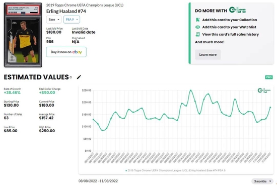 一张印有挪威职业足球运动员埃尔林·哈兰德肖像的球星卡在最近3个月内的交易价统计图源:CardLadder网站