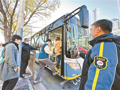 北京公交集团客二分公司重点加强早高峰时段运营保障。昨天早高峰时段,客二分公司团委组织团员青年、公交志愿者来到地铁通州北苑站、北苑路口西站与副中心客运公司职工设立冬运服务站台,向乘客提供指路换乘服务,组织乘客有序刷卡扫码乘车。