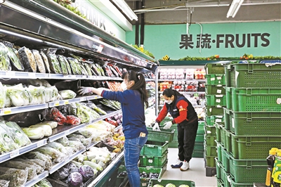 本报讯北京青年报记者从朝阳区获悉,为了做好疫情期间居民生活保障,朝阳区商务局多渠道加强供给保障,确保“批发端”进得来。同时,加强门店供应和末端配送管理,确保“零售端”送得到。目前朝阳区全区生活必需品市场货足价稳,运力稳定,建议市民不必过度囤货。图为京客隆劲松店仓库工作人员在备货。