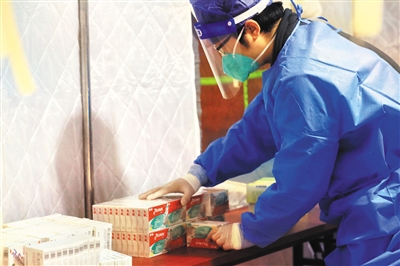 12月14日,西城区广安体育馆,工作人员整理为市民准备的药品。
