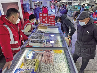 张玉玺介绍,1月9日,牛肉上市量为81头,羊肉上市量为1130只,海鲜水产上市量为101吨。临近春节,商户们也做好了面向市民开放,春节不打烊的准备,综合交易大厅里各类农产品的销量都有明显增加。