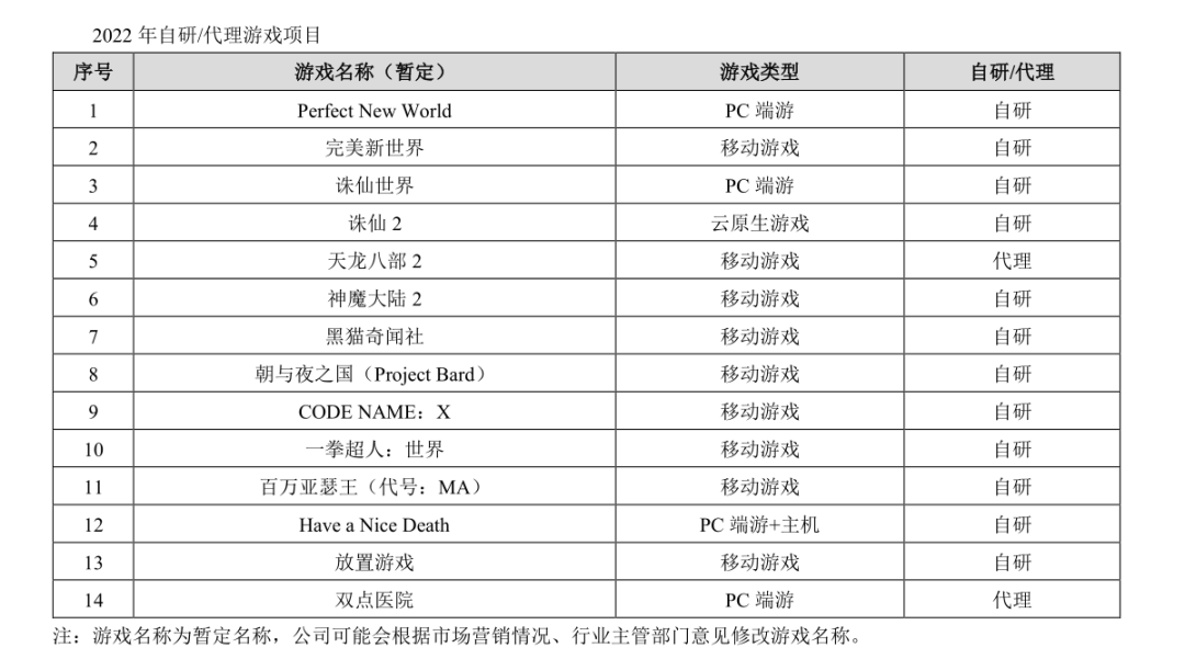而在财报中,他们也公开了部分储备产品,共14款;其中自研12款,代理2款;手游9款,PC端游4款,云原生游戏1款。涉及MMO、卡牌、横版动作、二次元、女性向等多个品类。