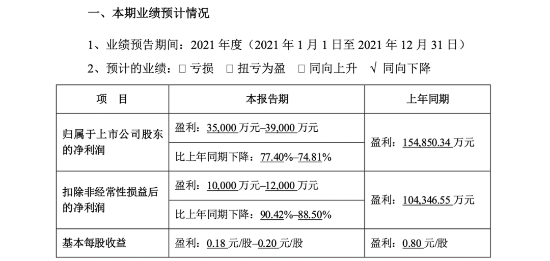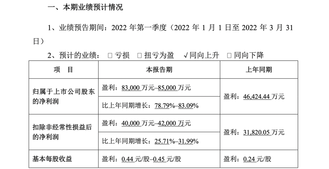 在给市场留足了时间去做心理准备后,4月15日,他们又公开了一份“2021年度业绩快报”,更具体地披露了部分的年报数据,一同发布的还有“2022年第一季度业绩预告”。对比之下,后者的数据就好看了太多。