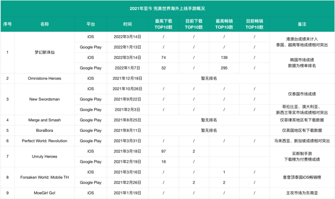 仅就出海而言,2021年的完美更像是在积累经验,对比去年他们不仅增加了出海手游的品类,同时对更多不同的市场进行了摸底尝试。虽然现阶段的成绩并不十分显著,但能针对自身专长的品类瞄准市场做有效的尝试。