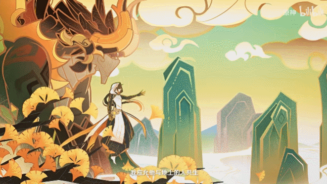 钟离是璃月的神明。他活了千年,历经沧桑,其属性是「岩」,象征着沉稳安定。在故事中,他守护着一方水土,却也大有归隐于世的想法。也因此,角色演示里他明明在与敌人交战,《尘世闲游》的主旋律却在威严的中式打击乐中,一直悠然自得。