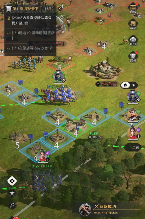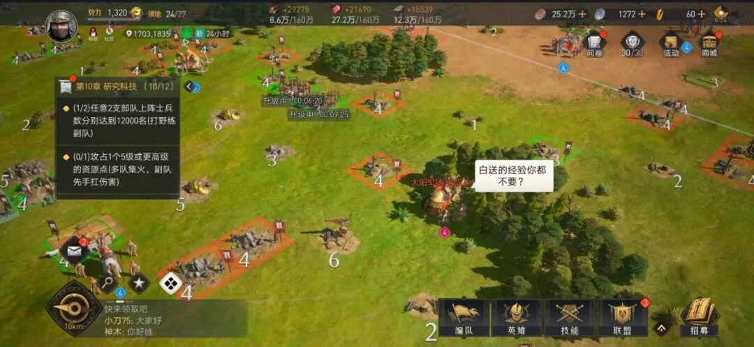 虽然游戏在细节上投入了很多精力,但这些细节并不影响游戏的主体玩法。《重返帝国》终究还是一个SLG架构的游戏。一旦玩家点击进入大地图,一切又回到了熟悉的味道。资源点、野怪、体力都是COK-like的传统SLG游戏模式。《重返帝国》并非没有创新,比如游戏重点宣传了自由行军的“即时战略”玩法能够让玩家在大地图上自由走位,手动发动武将技能,还能将部队拉到树林中进入“隐身模式”蹲点偷袭。