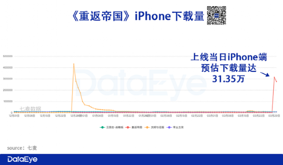 据DataEye预估,《重返帝国》上线当日iPhone端下载量为31.35万,明显低于《文明与征服》。然而到了4月前者在畅销榜上已经把后者甩在了身后,可见《重返帝国》导入的用户质量之高。