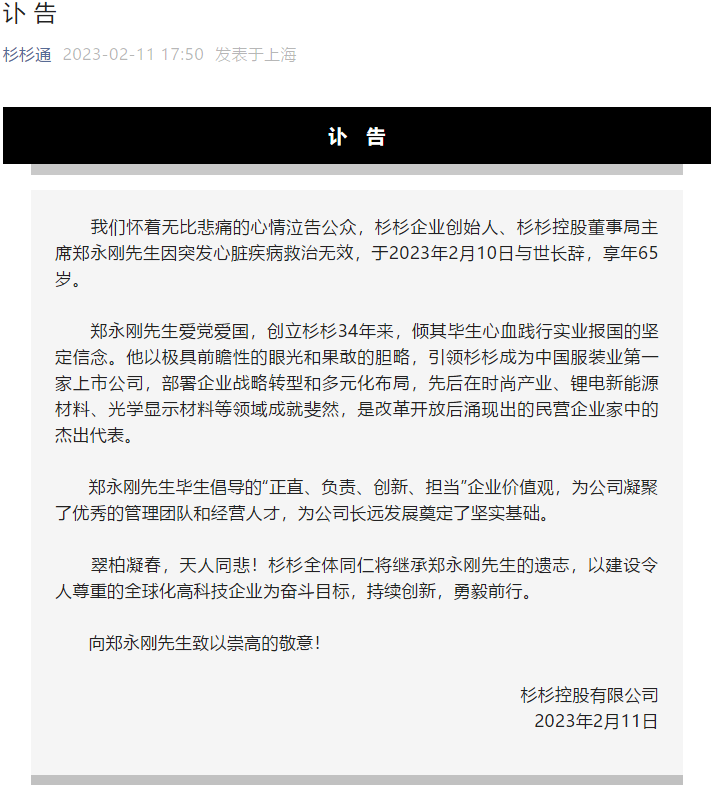 知名浙商、杉杉企业创始人郑永刚因突发心脏病昨日去世,享年65岁