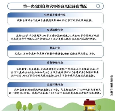 调查是这次自然灾害综合风险普查的基础,其任务是全面获取全国地震灾害、地质灾害、气象灾害、水旱灾害、海洋灾害、森林草原火灾等6大类23种灾害的致灾要素数据,人口、房屋、基础设施、公共服务系统、产业、资源和环境等6大类27种承灾体数据,政府、社会、基层家庭等3大类16种综合减灾能力数据,1978年以来年度灾害和1949年以来重大灾害事件调查数据,以及重点灾害隐患调查数据。