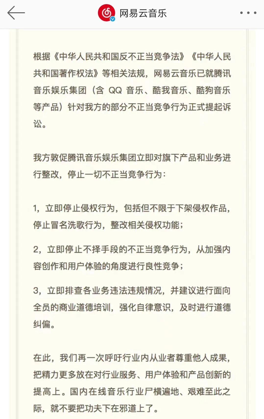 游戏这边的架还没吵完,音乐那边又开始了。4月27日上午10点,网易云音乐用一篇洋洋洒洒近3000字的长文加入“抗鹅办公室”,控诉腾讯音乐娱乐集团侵权,包括但不限于非法盗播偷放无授权歌曲、批量化冒名洗歌、跟随式抄袭产品创新等等。