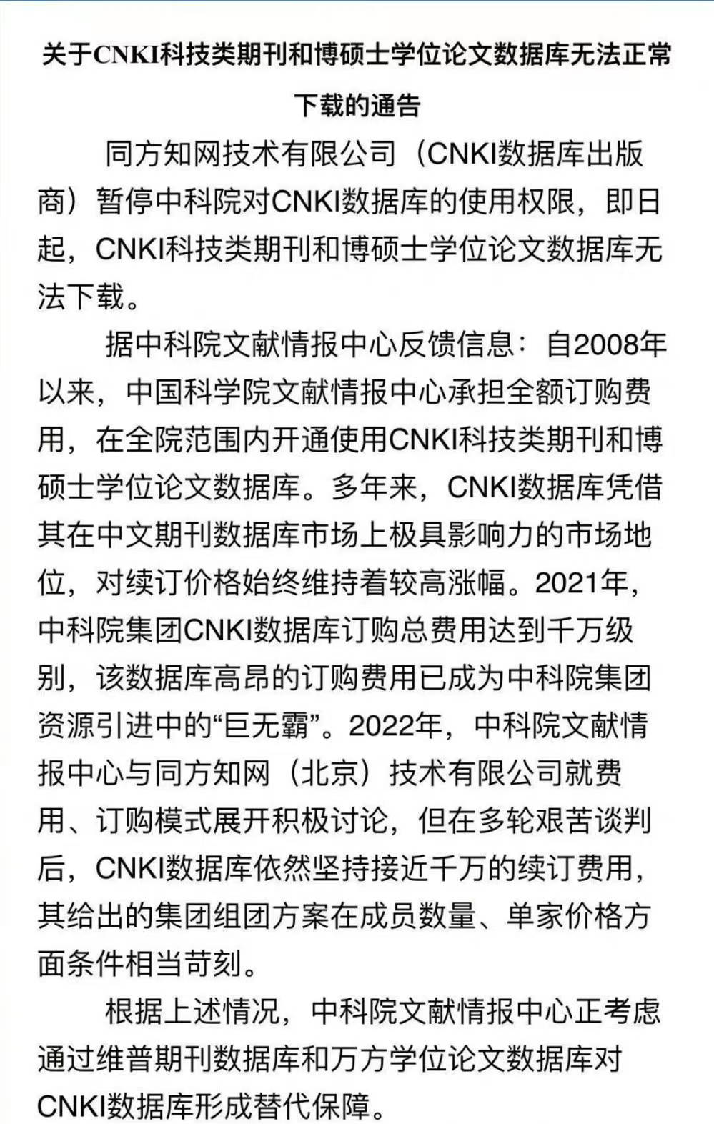 中科院文献情报中心的一则通告流传开来,其中提到“2021年,中科院集团CNKI(知网)数据库订购总费用达到千万级别,该数据库高昂的订购费用已成为中科院集团资源引进中的‘巨无霸’”,并表示因谈判无法达成一致,知网已暂停中科院对CNKI数据库的使用权限。