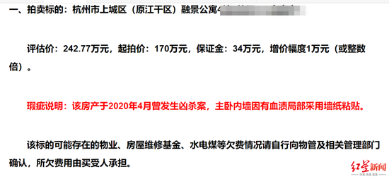 今年2月,杭州市上城区融景公寓4幢3单元的一套房产将被司法拍卖的信息被公布,信息显示,该套房面积83.09平方米,被法院查封,目前属于空置状态。但是其附加说明提示,“该房产于2020年4月曾发生凶杀案,主卧内墙因有血渍局部采用墙纸粘贴”。