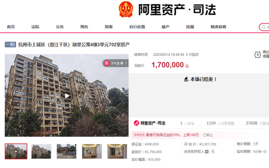 该房产于3月13日上午10时起拍,吸引了超过3.7万人围观,最终拍卖结束前2秒被以170万元的底价拍走,而司法拍卖网站信息显示,该场拍卖也仅有1人参与竞拍。