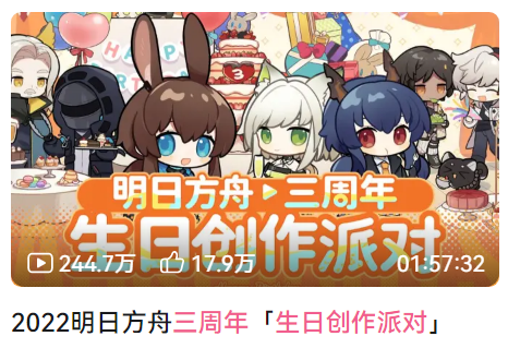 这种井喷式的二创现象当然不是今年才出现在《明日方舟》身上, 游戏一周年时,我们就有一篇文章分析了这点。 实际上,自《明日方舟》开服那一刻起,玩家群体二次创作的热情就已经开始燃烧:手书、同人图、小说甚至是动画,一直伴随着方舟玩家——以至于在直播当日,玩家们可以凑出一个长达两小时、包含大量高质量二创内容的《生日创作派对》。