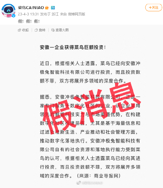 网传安徽一企业获得菜鸟巨额投资系假消息