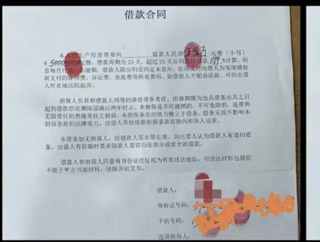 值得注意的是,虽然相关事件尚未有定论,但爆料人晒出的借款合同却持续成为舆论焦点。这份借款合同截图显示,借款金额500万,借款周期为25天,超过25天后利息按月息1.99%计算,同时借款合同上面未有出借人姓名。