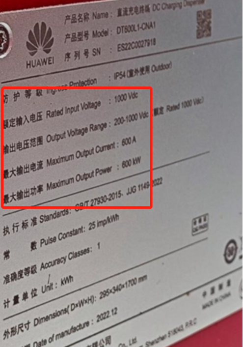 值得一提的是,据证券时报3月23日报道,近日,华为超充桩在网络曝光,有网友发布了一组华为自主研发生产的600kW超充桩实拍图。从铭牌信息可以看到,该超充桩的制造厂商为华为数字能源技术有限公司,充电桩型号为DT600L1-CNA1,输出电压范围200-1000V,最大输出电流600A,最大输出功率600kW。