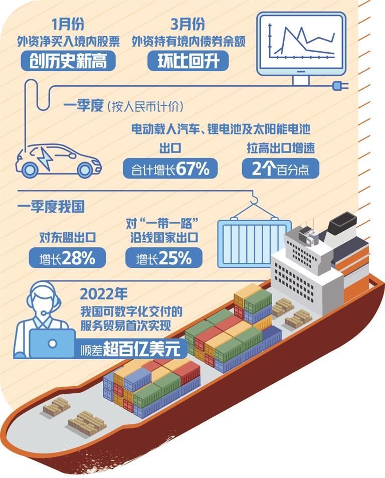 “近年来我国货物和服务贸易发展提质增效,有助于经常账户保持合理规模顺差,将继续为外汇市场平稳运行提供有力支撑。”王春英认为,得益于制造业持续转型升级和产业链供应链的完整稳定,我国出口产品竞争力稳步提升。例如,今年一季度,按人民币计价,电动载人汽车、锂电池以及太阳能电池出口合计增长67%,拉高出口增速2个百分点,较去年拉动作用进一步增强。