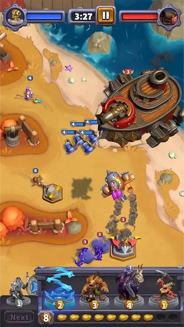 具体到游戏玩法,则是PVP中两名玩家各有一个基地,如果基地被破坏,就会输掉游戏,你需要通过放置不同的兵种与敌人进行战斗,用来保卫己方的基地不被攻陷或摧毁敌人的基地。地图上会有一些特殊建筑,比如集合石、中立防御塔、金矿等等。