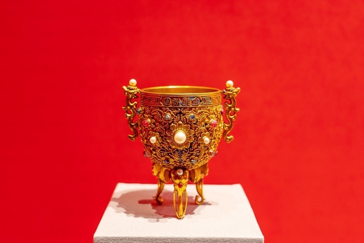 故宫博物院举行「何以中国」特展,一件乾隆时期制作的「金瓯永固杯」正在展出,北京。这件金质酒器高12.5厘米,形状如鼎,耗用20两黄金制作,并镶嵌21颗红蓝宝石、11颗珍珠和4颗碧玺宝石,是清代皇帝历年「开笔仪式」的专用礼器。「何以中国」特展共展出石器时期至清代的130件重要文物,呈现中华文明的起源和发展历程。摄影师:iDaily Media