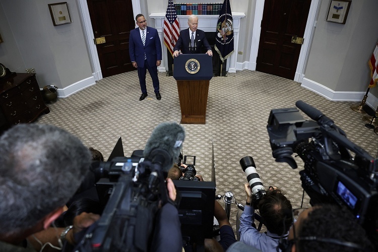 美国总统 Joe Biden 在学生贷款减免计划被裁定违宪后发表演讲,华盛顿白宫。6月30日,美国联邦最高法院以6:3投票结果裁定 Biden 提出的减免学生贷款计划「违反美国宪法」,认定总统无权大规模减免学生贷款。美国最高法院意见书指出 Biden 政府只有在获得国会明确批准的情况下才可以实施金额如此巨大的项目。白宫公布数据显示美国约有4300万人符合减免学生贷款计划的资格,目前已有2600万人提出减免申请,该项目预计在未来30年内对美国政府造成4000亿美元额外支出。摄影师:Chip Somodevilla