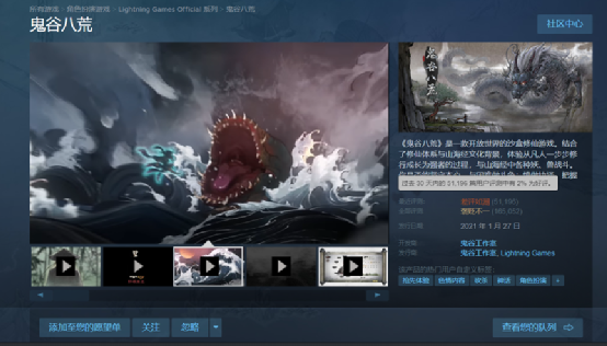 根据Steam商店页面显示,《鬼谷八荒》在过去30天内收获了将近52000条玩家评测,其中差评率高达98%。