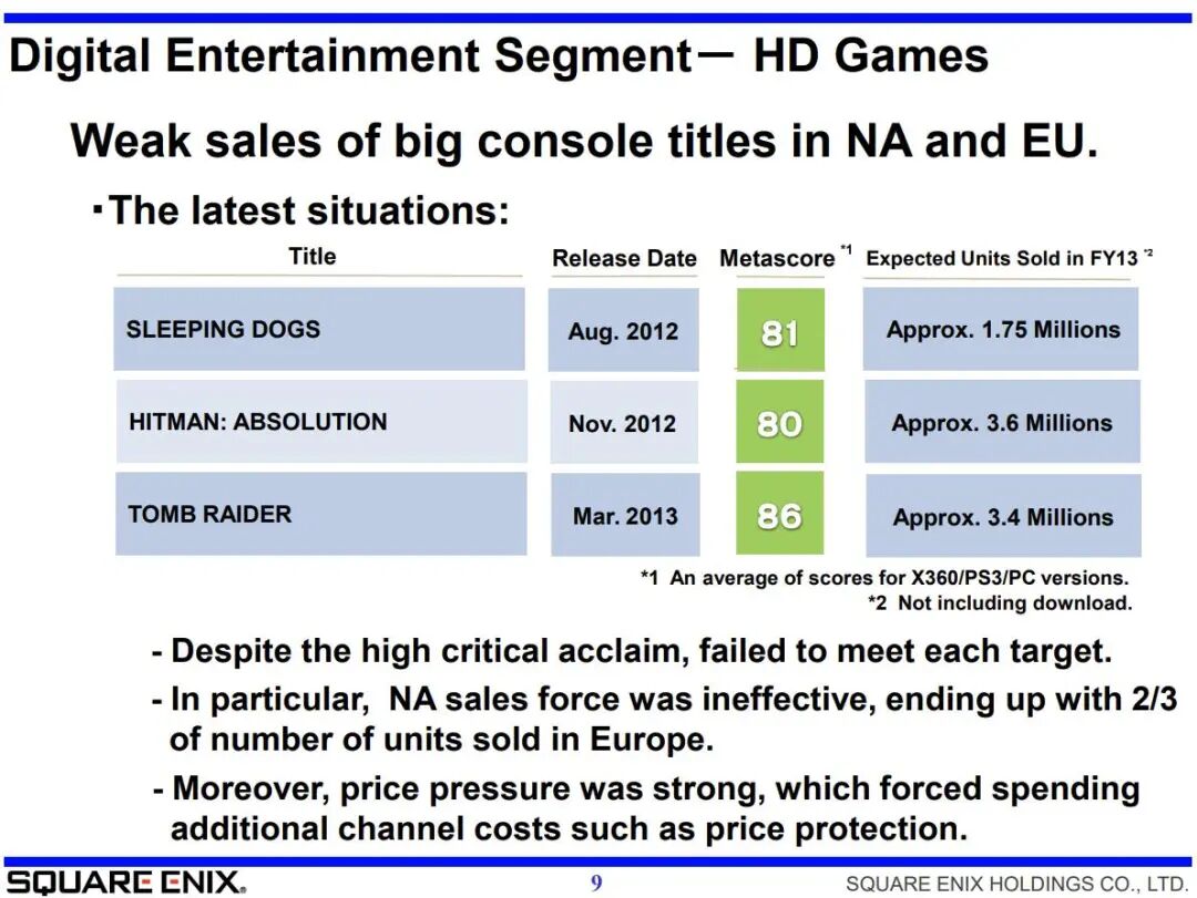 之后两年,《杀手 赦免》和《古墓丽影》相继发售,Square Enix 也开始过上了欧美大作连番上市的日子。只是收购的蜜月期似乎没有持续太久,在 2013 年 3 月 26 日的年度财报里,Square Enix 列出了《热血无赖》《杀手 赦免》《古墓丽影》3 款游戏的实体版销量,分别为 175 万套、360 万套、340 万套,评语为: