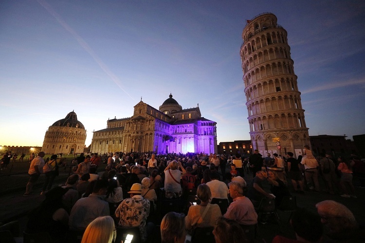 人们聚集在奇迹广场庆祝比萨斜塔奠基850周年,意大利。8月9日是比萨斜塔奠基850周年纪念日,比萨市政府计划举行为期一年的展览、音乐会、电影放映会等活动进行庆祝。比萨斜塔的第一块基石铺设于1173年8月9日,施工过程中因倾斜问题而一度中断,直至1372年才正式竣工,建造历时长达199年。比萨斜塔目前高度为55.86米,倾斜幅度为3.97度,每年吸引超过50万名游客。摄影师:Fabio Muzzi