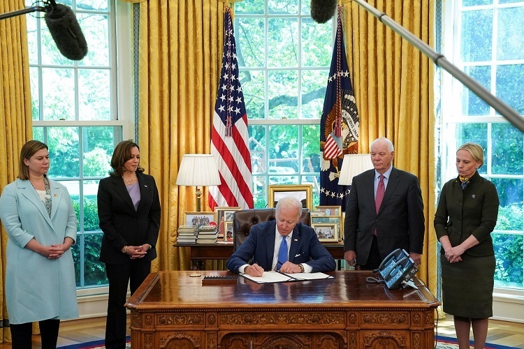 美国总统 Joe Biden 签署《乌克兰民主防卫租借法案》,华盛顿白宫。5月9日,Biden 签署一项旨在加快向乌克兰提供武器的新法案,主要内容是授予总统更大权限向乌克兰提供武器并简化程序流程。这是美国政府自第二次世界大战后首次使用武器租借法案。Biden 还敦促国会尽快批准对乌克兰提供330亿美元援助的相关法案。俄乌冲突爆发以来,美国已累计向乌克兰提供38亿美元军事援助。摄影师:Kevin Lamarque