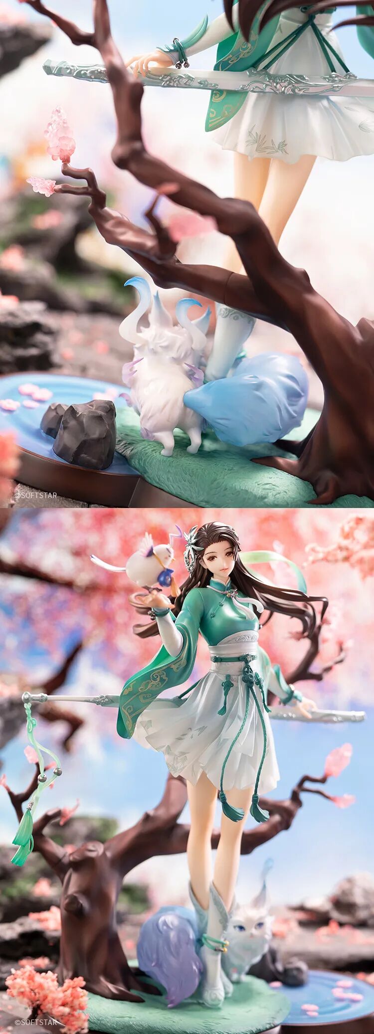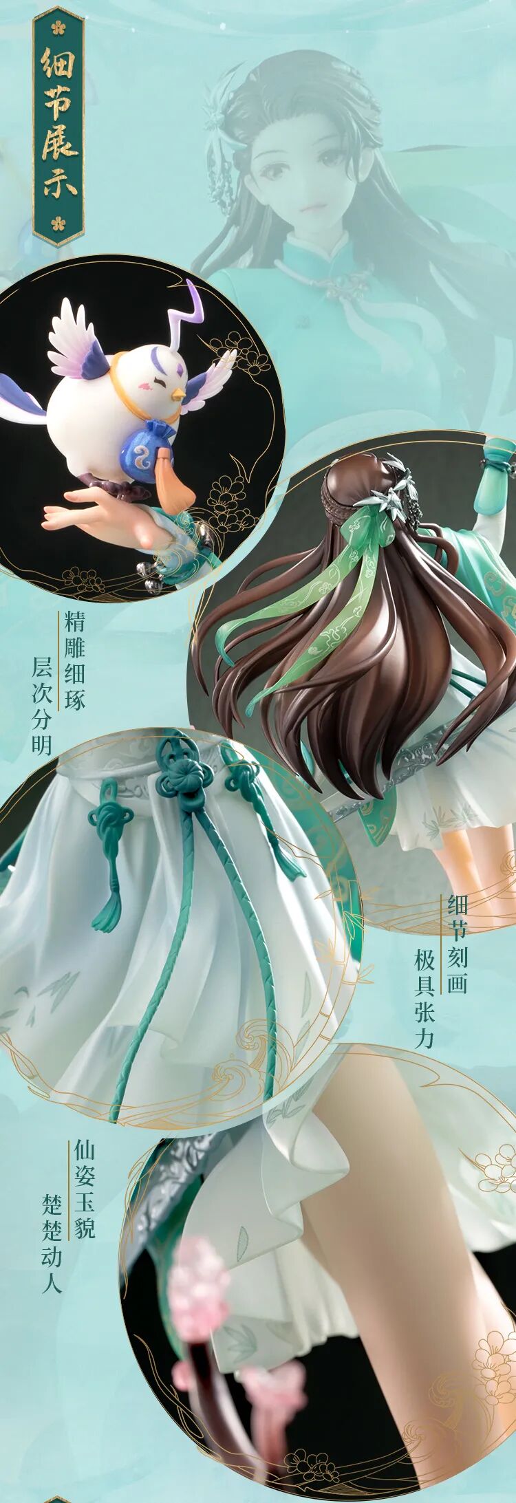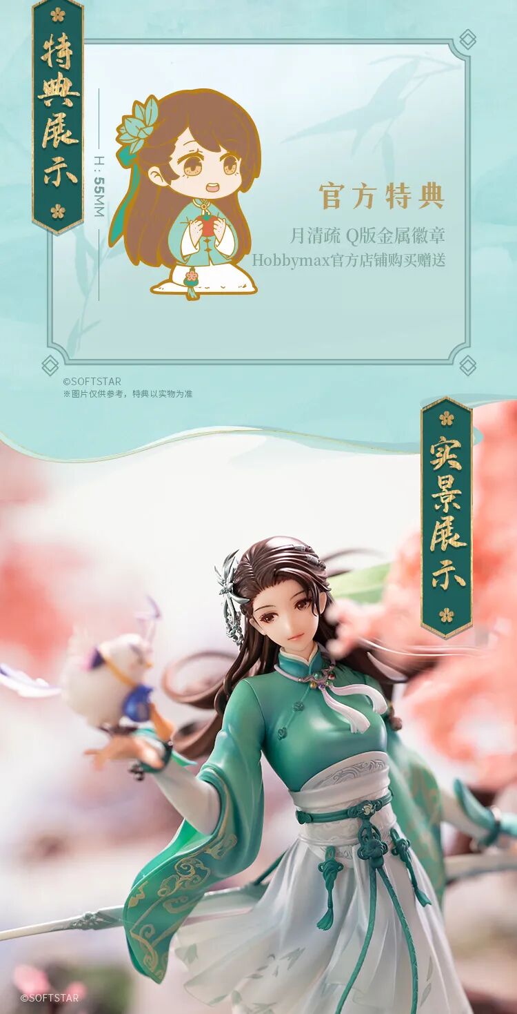月清疏1/8手办全高约为25厘米。手办采用了月清疏在游戏中所穿着的默认服装造型,淡绿色的上衣搭配上半透明的长裙,腰间系带上的绳结也进行了细致的刻画。在背后腰间的碧海剑以及手中的Q版巧翎、树花底座边的“山神”都凸显出月姐姐的坚韧的性格和柔美的一面,展现出了她修道者的身份。