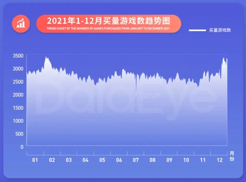据DataEye-ADX发布的《2021移动游戏全年买量白皮书》,自去年下半年以来,游戏买量市场竞争越发白热化,每月投放游戏数高达6000款,大幅高于2020年的4000款水平。