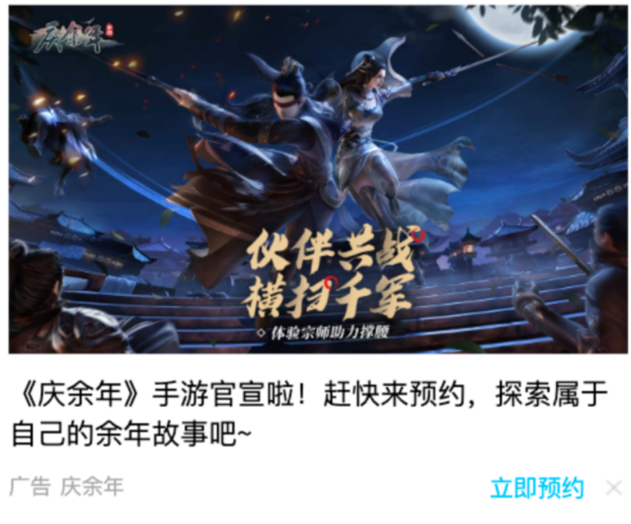 从这个角度来看,《庆余年》手游预热期的推广目的更多是唤醒IP受众并转化为游戏玩家。因此在投放策略上,《庆余年》手游注重扩充/转化游戏核心人群,将表单预约和跳转按钮点击作为目标进行预约投放,不仅实现很好的预约注册转化效果,还能广泛收集到IP受众对游戏的意向和偏好,为后续游戏内容更新及优化提供有效参考。